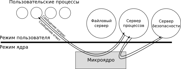 Альтернативой является построение операционной системы на базе микроядра, работающего также в привилегированном режиме и выполняющего только минимум функций по управлению аппаратурой. В этом случае более высокоуровневые функции операционной системы выполняются специализированными компонентами — серверами, работающими в пользовательском режиме. Управление и обмен данными при этом осуществляется через передачу сообщений, доставка которых является одной из основных функций микроядра (см. Рисунок 1.6, «Структура операционной системы с микроядром»).