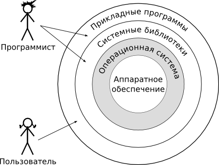 Программное и аппаратное обеспечение можно выстроить в виде иерархии, каждый уровень которой представляет собой виртуальную машину со своим интерфейсом (например, Рисунок 1.4, «Уровни вычислительной системы»), за которым скрываются детали нижележащего уровня.
