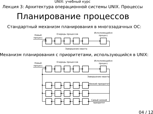 В операционной системе UNIX традиционно поддерживается классическая схема мультипрограммирования. Система предоставляет возможность параллельного (или псевдопараллельного в случае наличия только одного аппаратного процессора) выполнения нескольких пользовательских программ. Каждому такому выполнению соответствует процесс операционной системы.