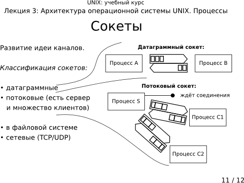 Интерфейс сокетов позволяет явно разделить во взаимодействии двух процессов серверную и клиентскую часть. Серверный процесс инициализирует сокет и ждёт входящих соединений от других процессов. Клиентский процесс устанавливает соединение, и с этого момента по образовавшемуся каналу можно передавать поток данных в обе стороны. Такие сокеты называются потоковыми. Другой тип сокетов, датаграммный, позволяет отправлять сообщения (длиной не более 64 кбайт) между процессами, привязанными к данному сокету.
